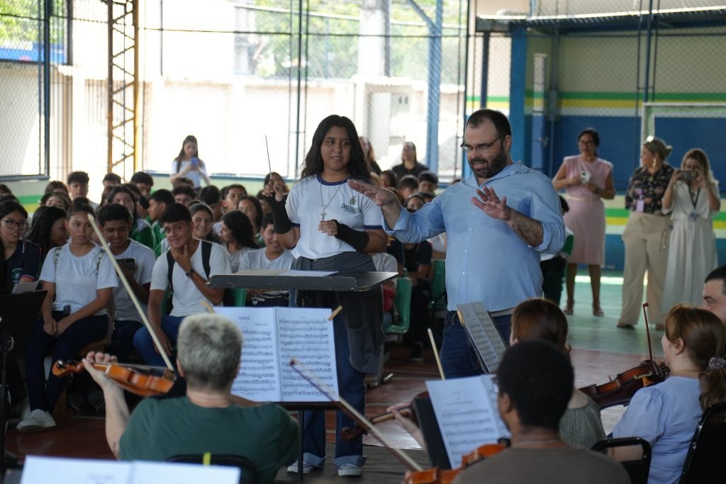 Para ela, o projeto também democratiza o acesso à cultura. “Nem todo mundo tem tempo ou condições de ir ao teatro. Então, trazer a orquestra para dentro da escola é muito importante, porque nos dá acesso sem sair da nossa realidade. Nunca tinha visto uma filarmônica se apresentando na quadra de uma escola assim, e achei a ideia do projeto excelente.”